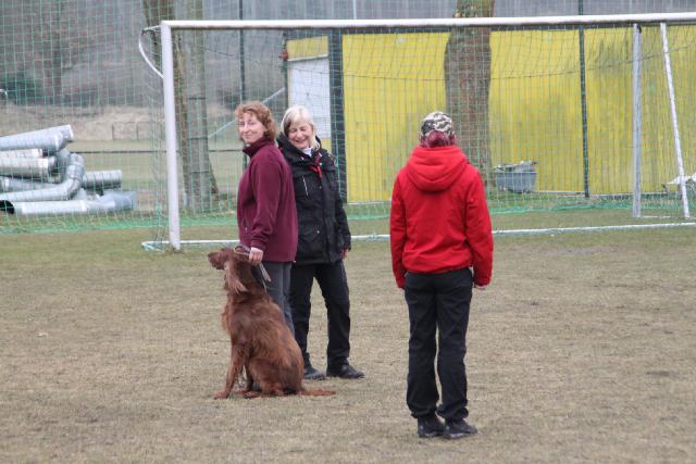 Das erste Team machte sich nach der Chipkontrolle für die Unterordnung bereit. Corinna mit Charly und Claudia mit Cardhu meldeten sich bei Matthias an. Nach der Ablage von Cardhu lief Corinna mit Charly die Unterordnung. Im Anschluss lief Claudia mit Cardhu die Unterordnung.
